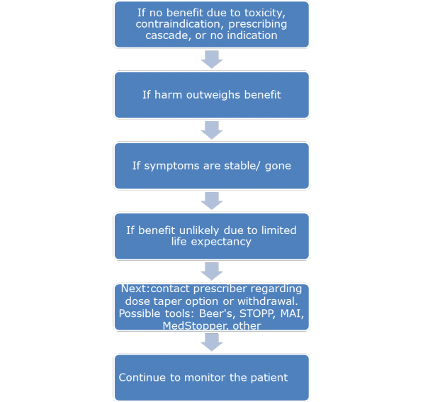 Tools that help identify potentially inappropriate medication use include Beer’s Criteria, STOPP (Screening Tool of Older Persons' Prescriptions).6 Additional tools include START (screening tool to alert to the right treatment) criteria, and the Medication Appropriateness Index (MAI).6 These and other tools have benefits and provide a specific approach to medication management. No one tool or strategy was shown to be superior in improving patient-related outcomes. Figure 1 below provides a simplified approach to the steps for deprescribing.